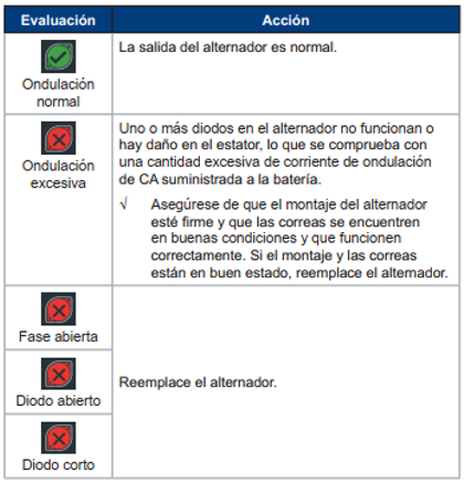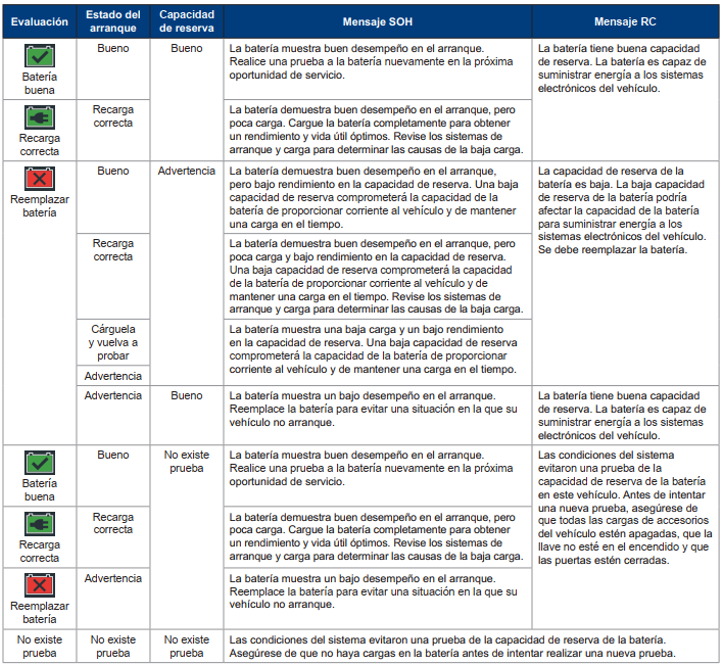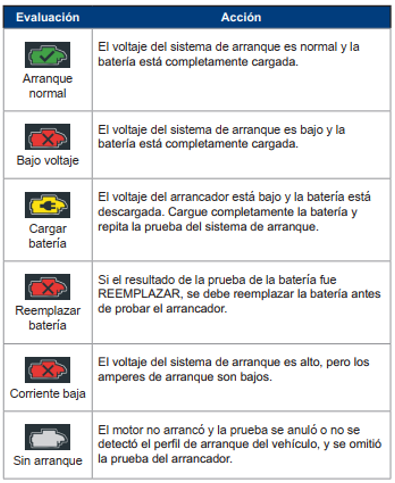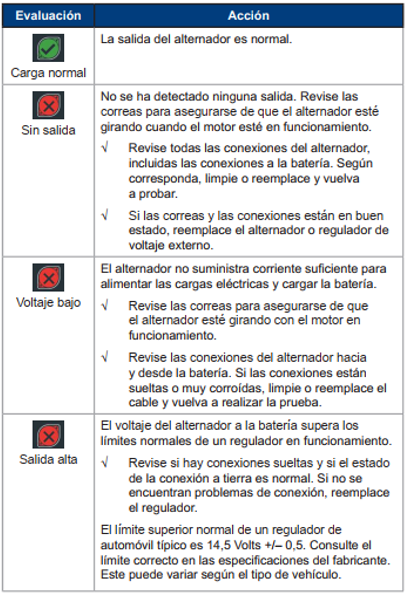 Tablas de decisión de los resultados de la prueba Resultados de la prueba de la bateríaResultados de la prueba del arrancadorResultados de la prueba del alternadorResultados de la prueba del diodo Updated on febrero 1, 2021 Was this article helpful? Yes No Related Articles Configuración inicial Conexiones Parte delantera/posterior de la unidad de carga Precauciones de seguridad Menú principal