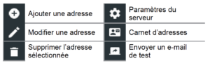 Affiche toutes les adresses électroniques saisies. Des adresses peuvent être ajoutées, modifiées et supprimées (Administrateur uniquement). Les comptes courriel saisis sont ajoutés au carnet d’adresses électronique. Les adresses électroniques fréquemment utilisées peuvent être sélectionnées dans la liste affichée au lieu d’avoir à les saisir chaque fois.