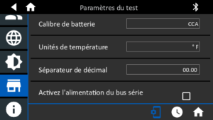 Accédez aux informations de l’atelier par défaut, notamment le nom de l’atelier, l’adresse et le numéro de téléphone. Accédez également aux informations standards des tests de batterie, comme sa capacité nominale, les unités de température et le séparateur de décimale. Cette fonction permet également de régler la date et l’heure de l’analyseur.